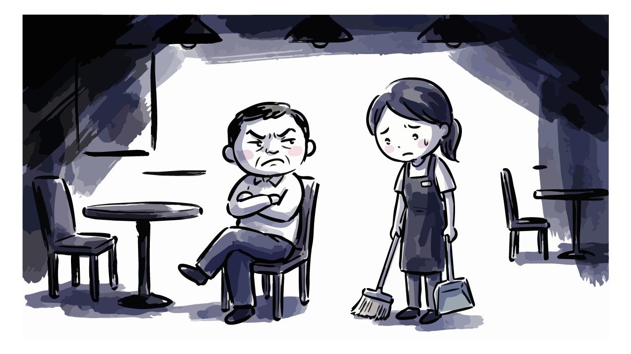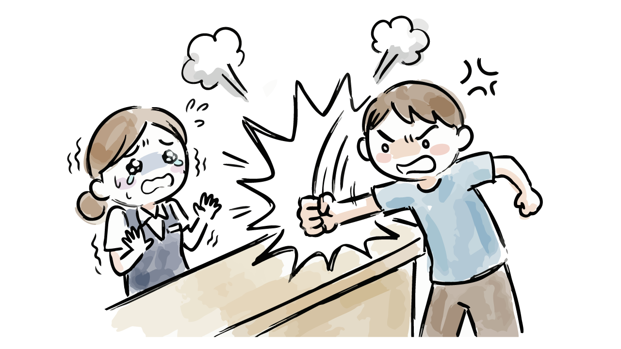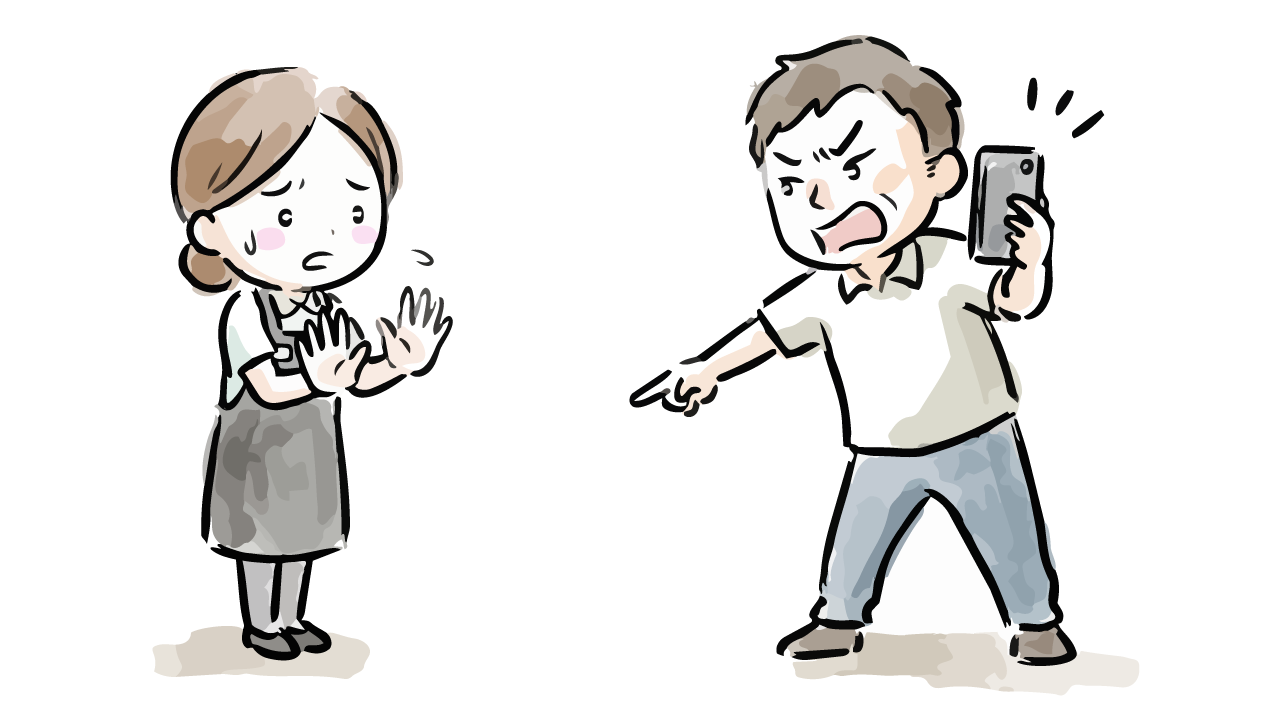 激昂して怒鳴り散らす男性客に対し、冷静にスマートフォンで会話を録音し証拠保全を行う女性スタッフを描いた無料イラスト素材です。近年問題となっているカスタマーハラスメント(カスハラ)の現場において、言った言わないの水掛け論を防ぐための対策シーンを表現しています。手書き風のシンプルで親しみやすいタッチながら、緊迫感のあるビジネスシーンにも馴染むデザインです。トラブル対応マニュアルや防犯ポスターなどの挿絵として最適で、登録不要ですぐにダウンロードしてご利用いただけます。